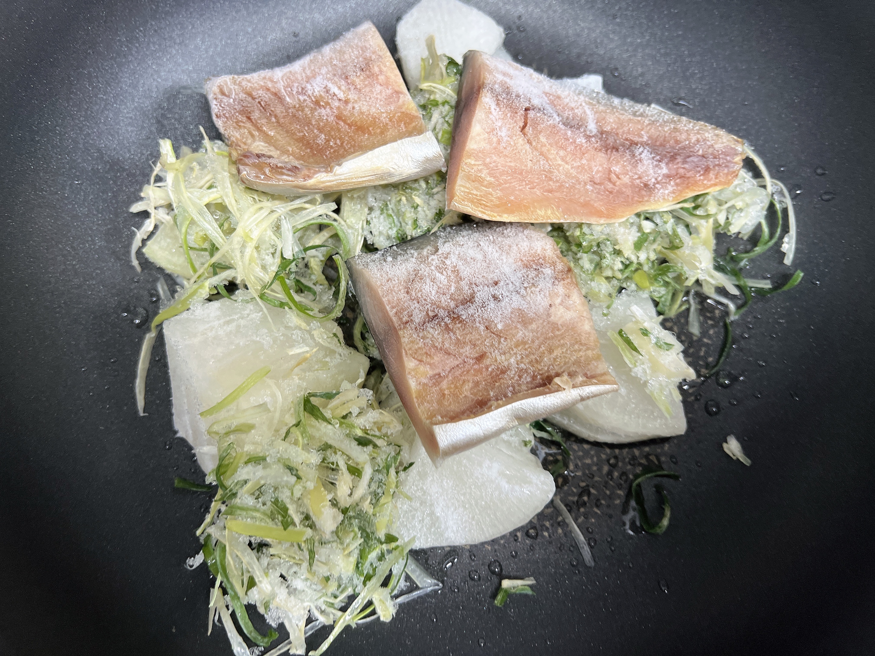1. 냄비에 무 깔고, 토막 고등어 넣고 파 넣기