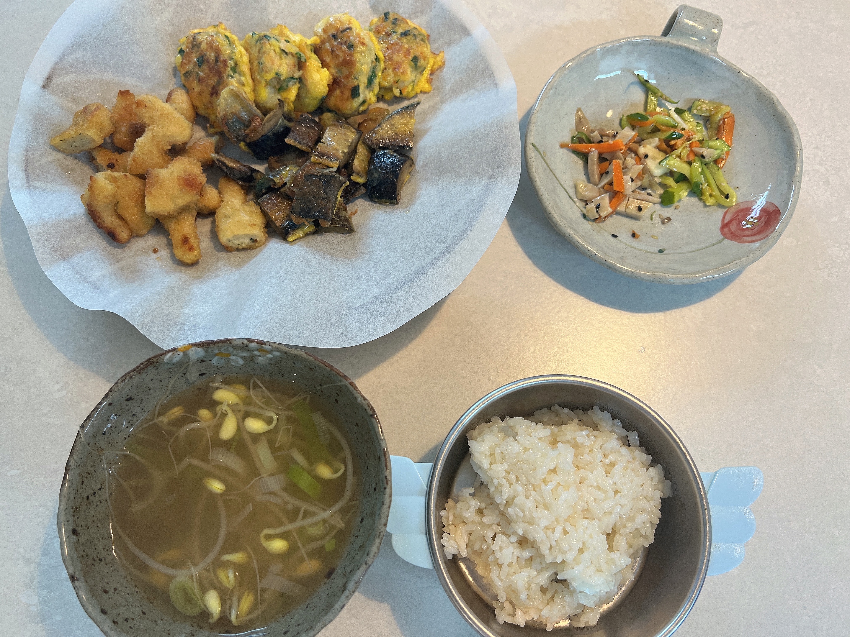 그 사이에 같이 먹을 반찬도 따뜻하게 준비합니다. 새우동그랑땡, 가지전, 용가리치킨 입니다.