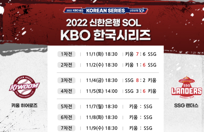 한국시리즈 KS 5차전 일정 : 11월 7일(월) 18:30 인천 SSG 랜더스 필드