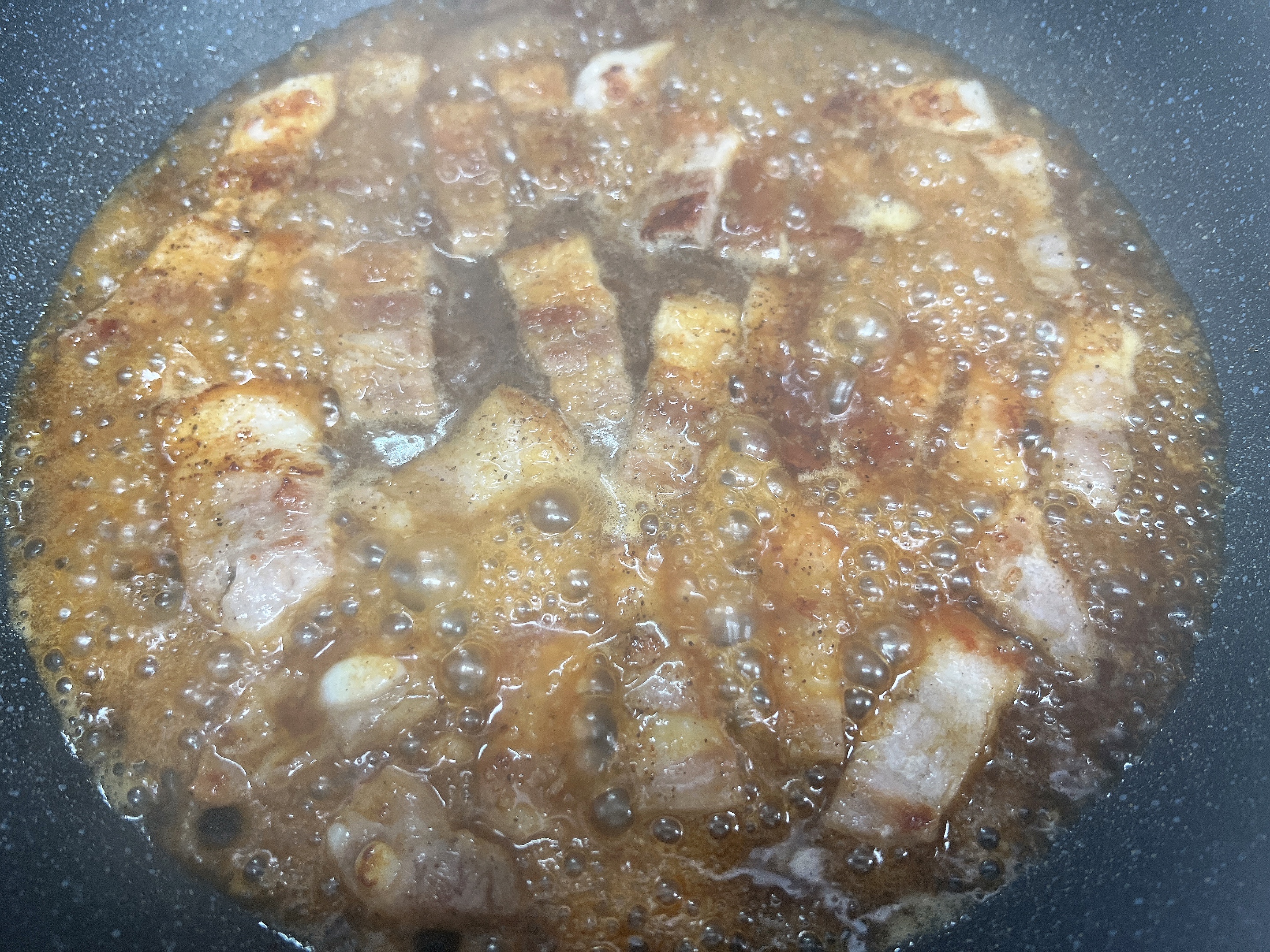 저는 뚜껑을 안 덮어 주었는데요. 양념을 조려야 해서요. 다음에는 뚜껑을 덮고 한번 해봐야 겠어요, 왠지 삼겹살의 수분을 더 잡아줄 것 같다는 믿음이 생겨서요.