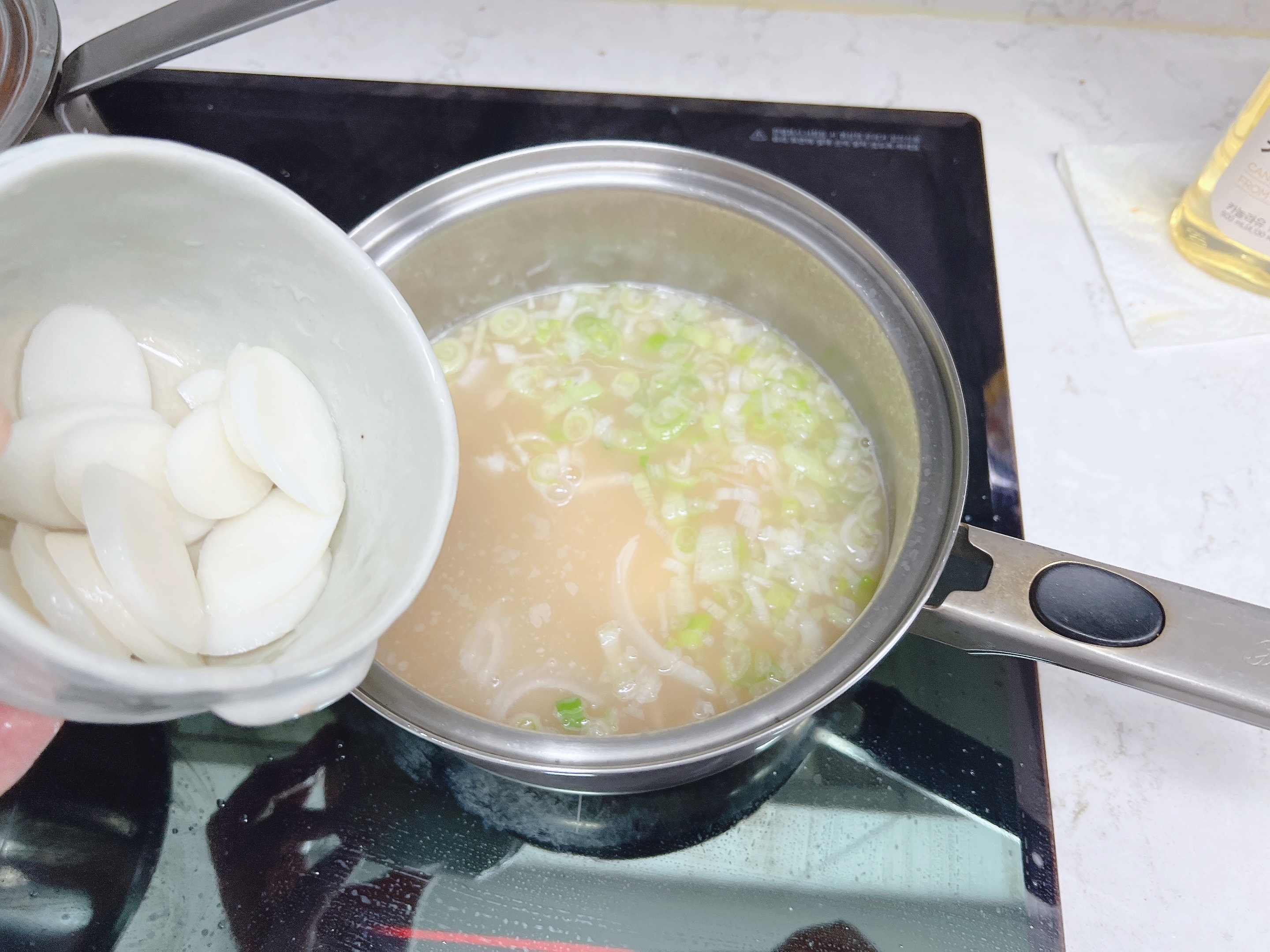 냉동실에 있던 떡국떡이라, 요리 시작전에 미온수에 잠시 담궈 두었다가 사용하였습니다. 이렇게 하면 느낌상 떡이 더 빨리 야들야들해 지는 것 같습니다.
