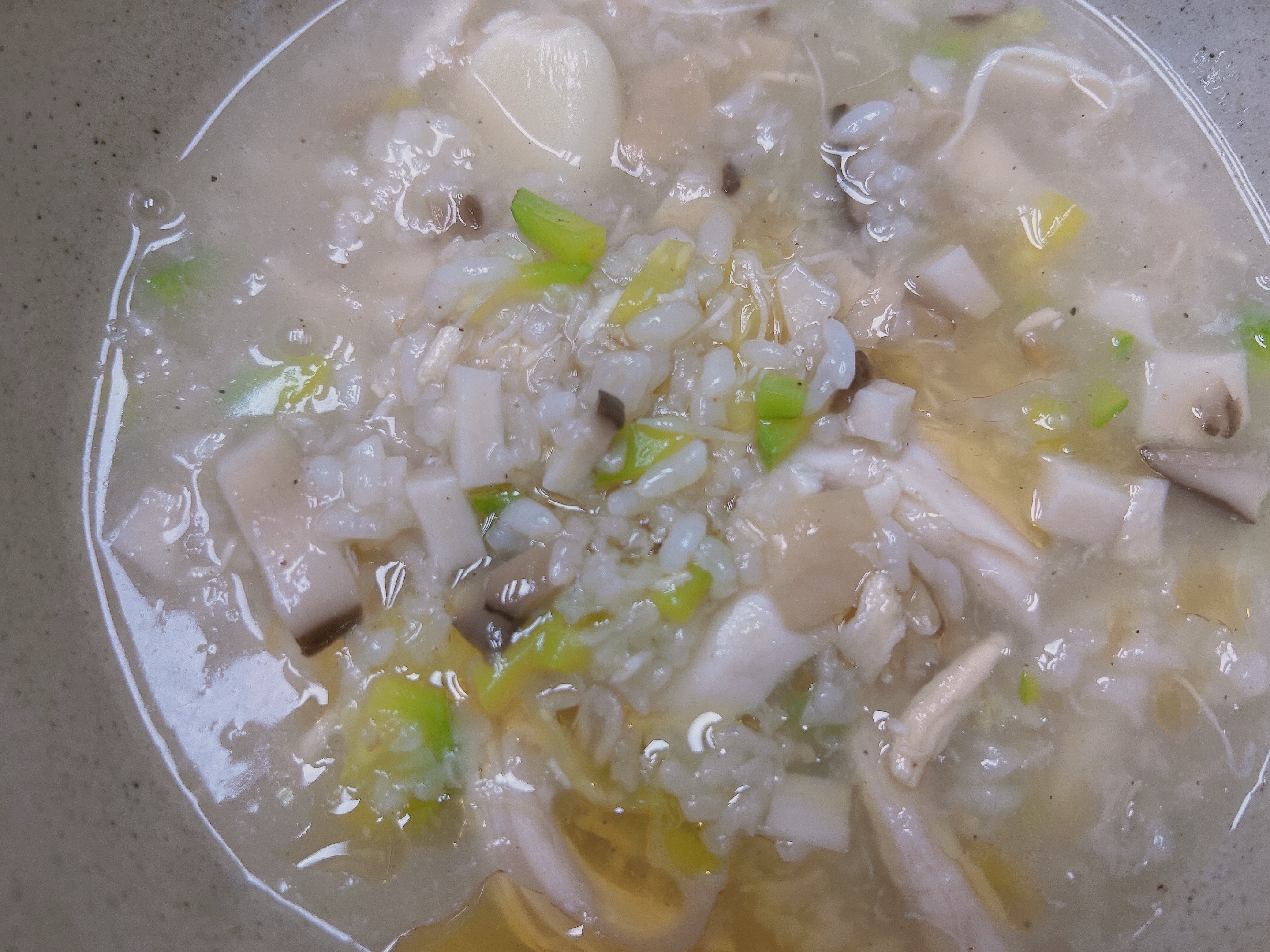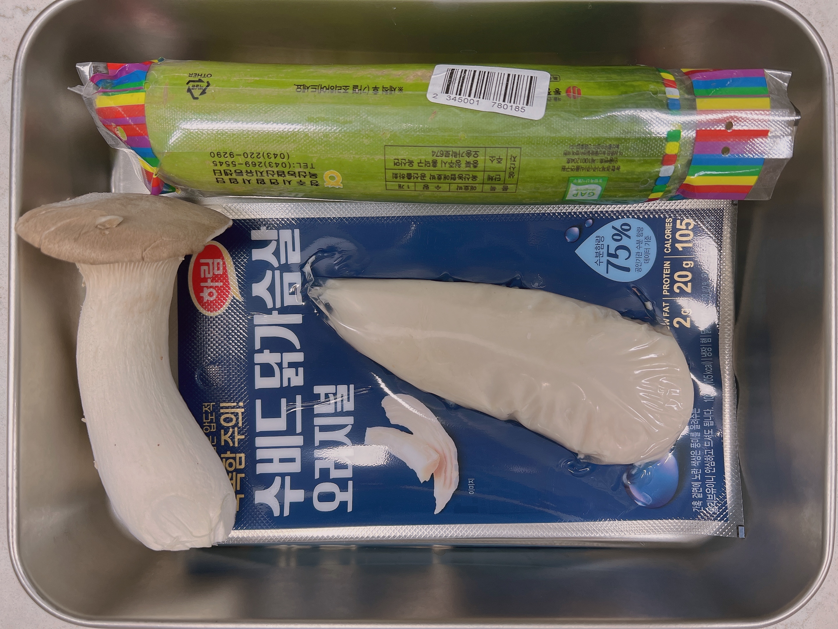 재료 : 비비고 전복삼계죽, 닭가슴살, 새송이버섯, 애호박