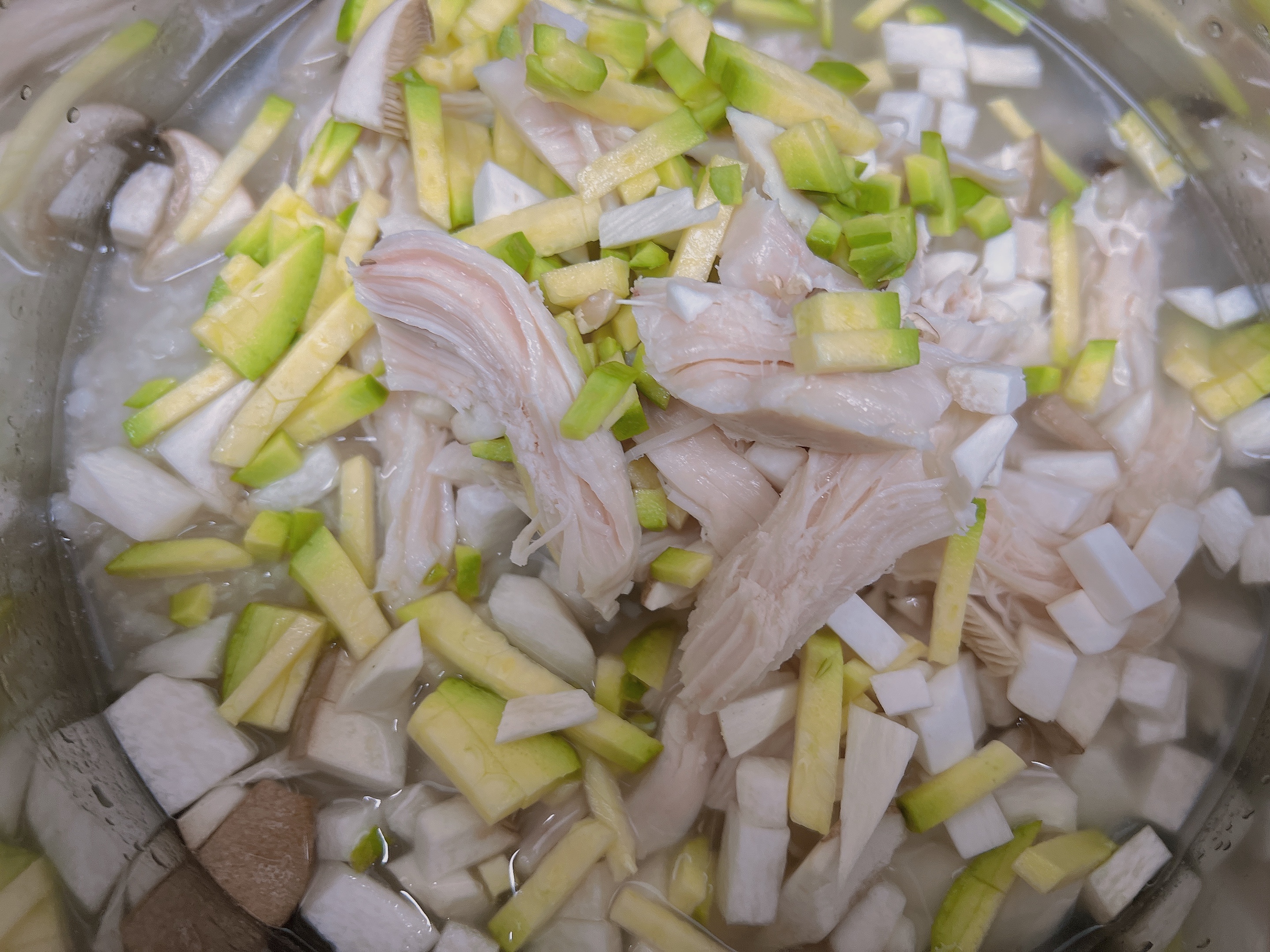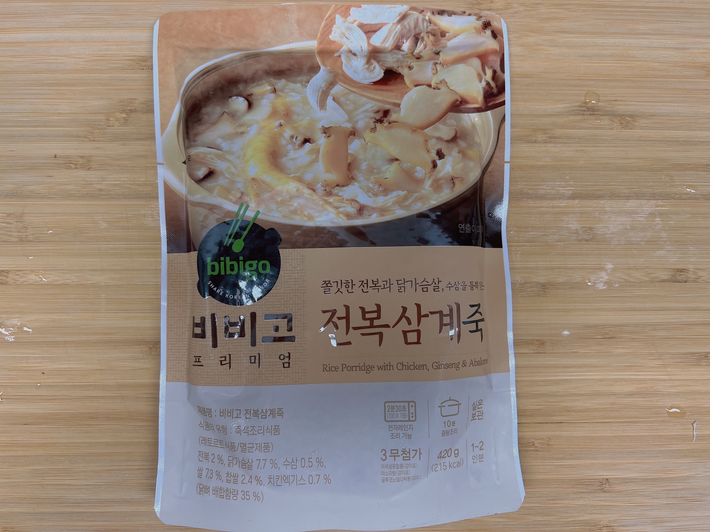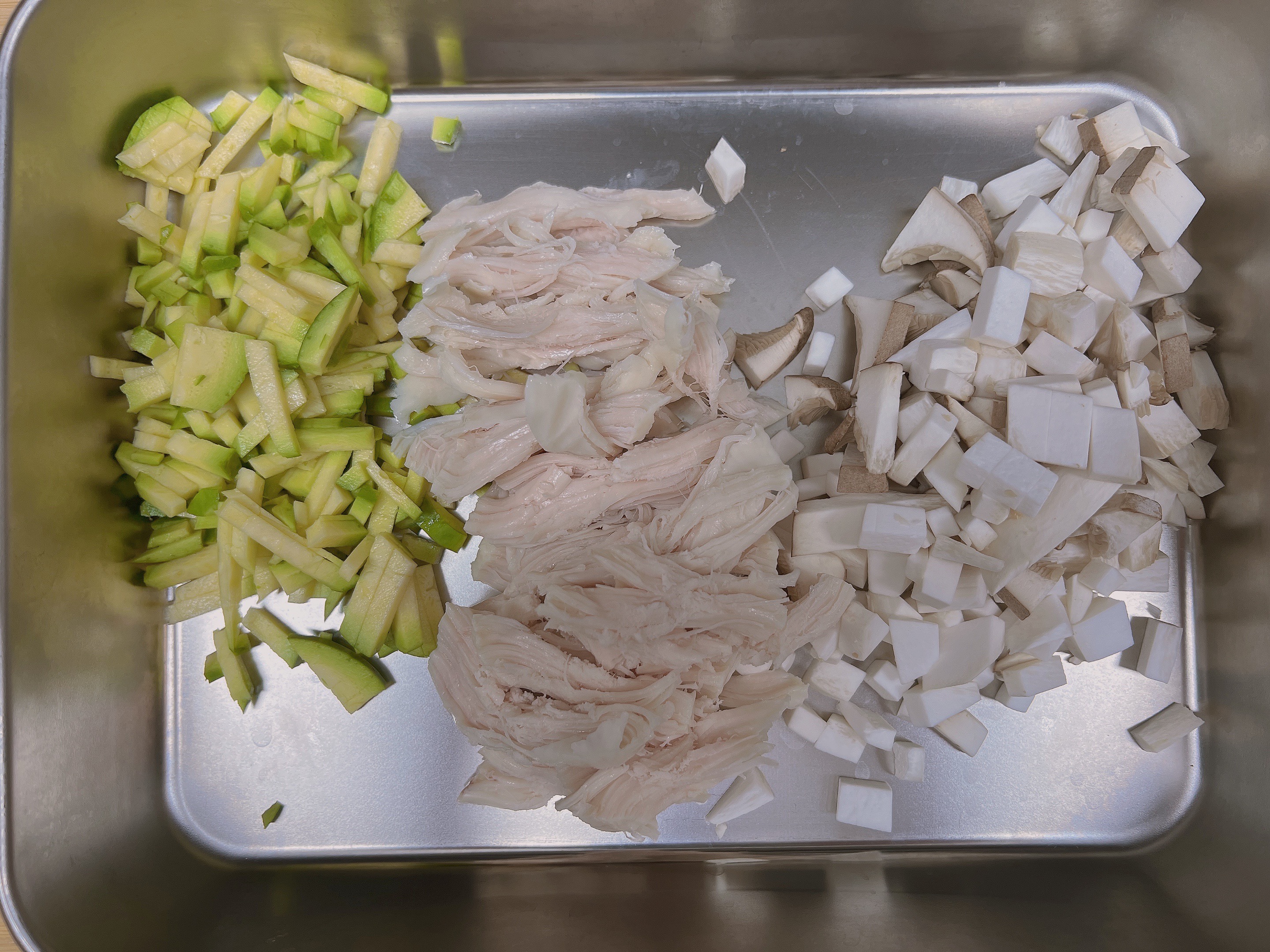 재료 : 비비고 전복삼계죽, 닭가슴살, 새송이버섯, 애호박