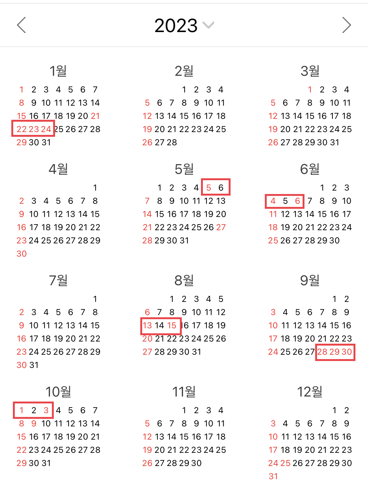 빨간색으로 표시한 공휴일은 연휴로 쉬기 좋은 휴일입니다.