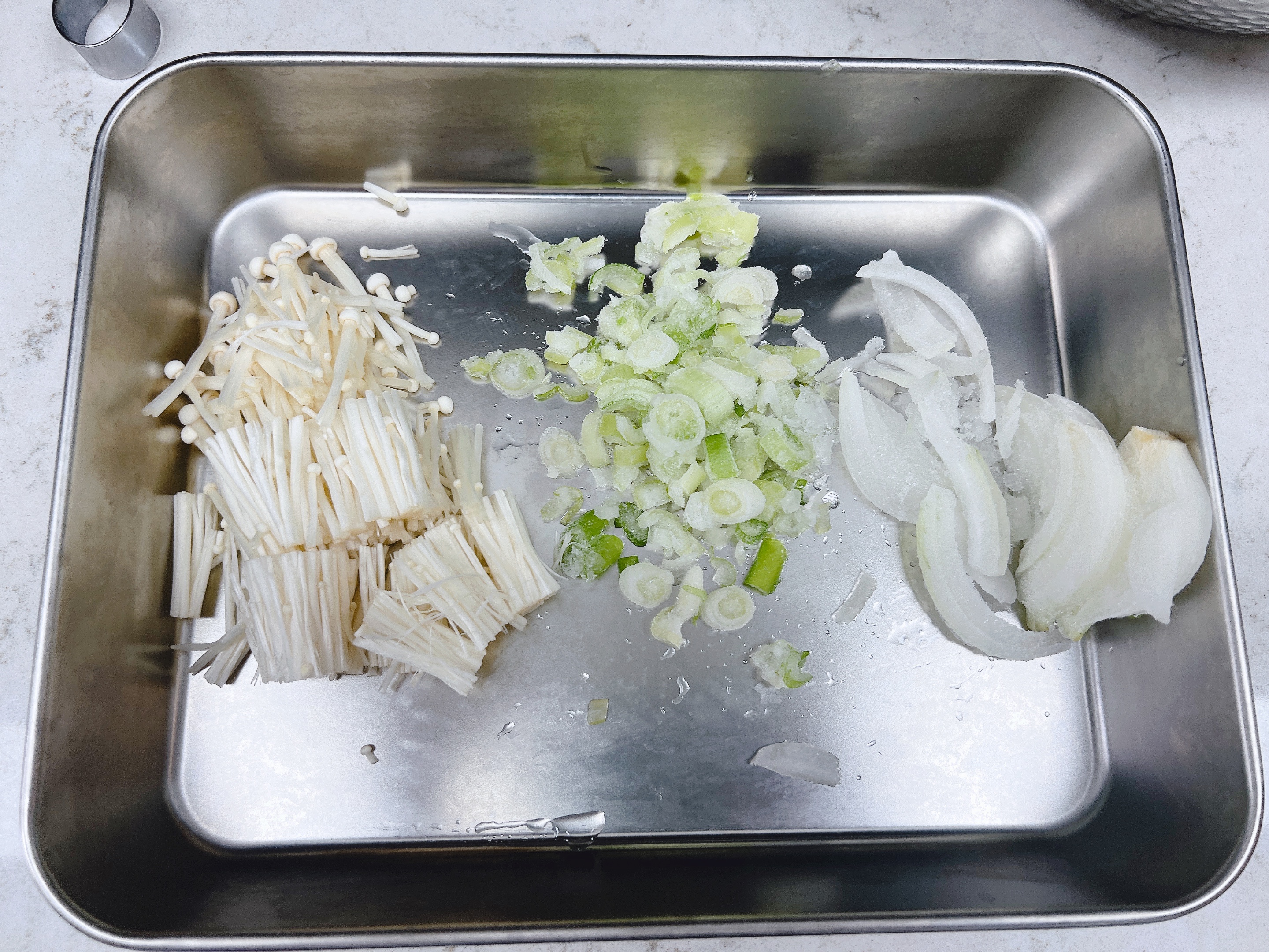 저는 항상 저희집 냉장고에 준비되어 있는 기본 야채 한줌씩(파, 양파) 넣었습니다. 팽이버섯은 저희 아내가 좋아해서 냉장고에 거의 항상 있습니다. 팽이도 함께 넣었습니다.