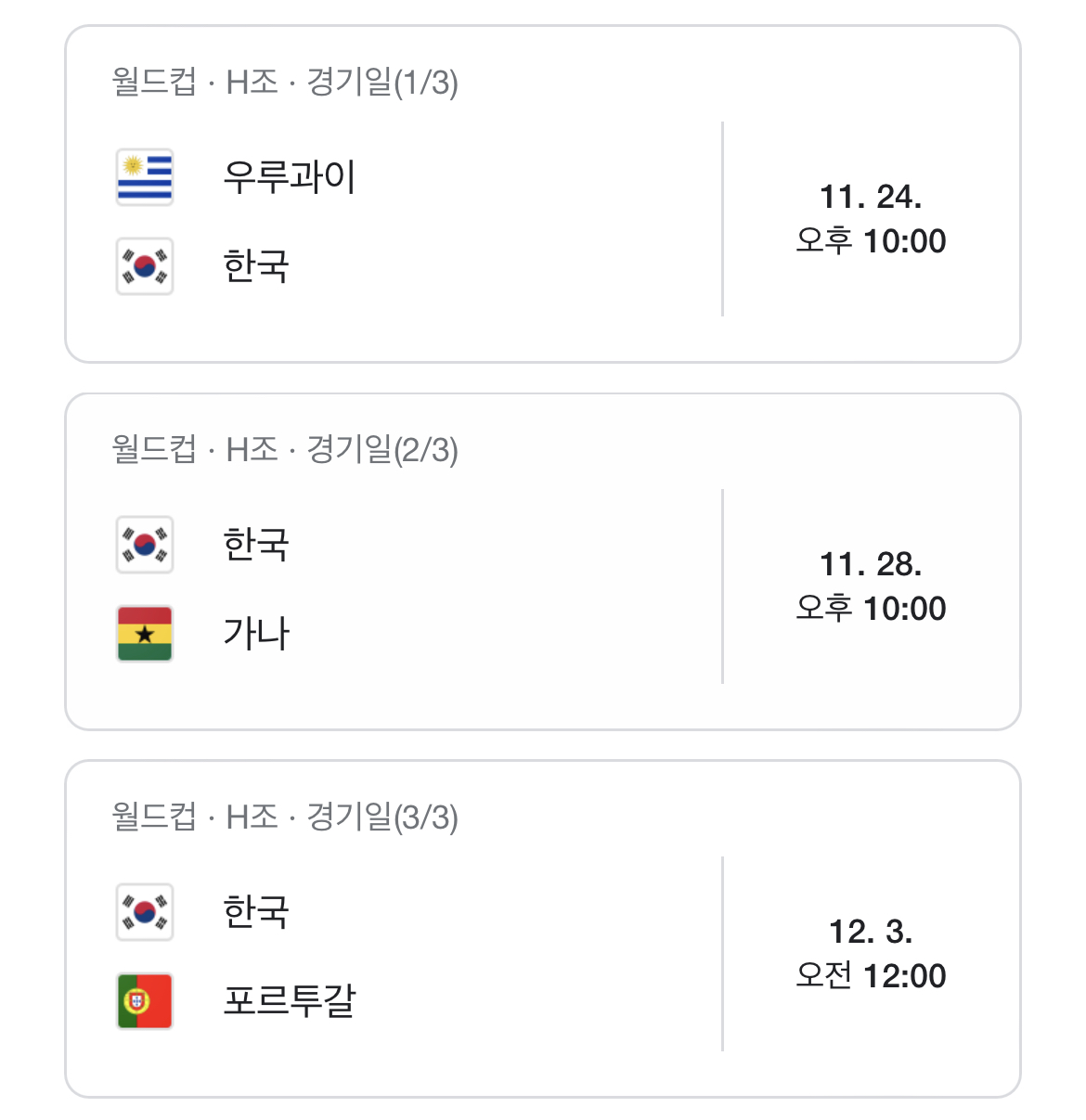 - H조 : 포르투갈, 가나, 우루과이, 대한민국