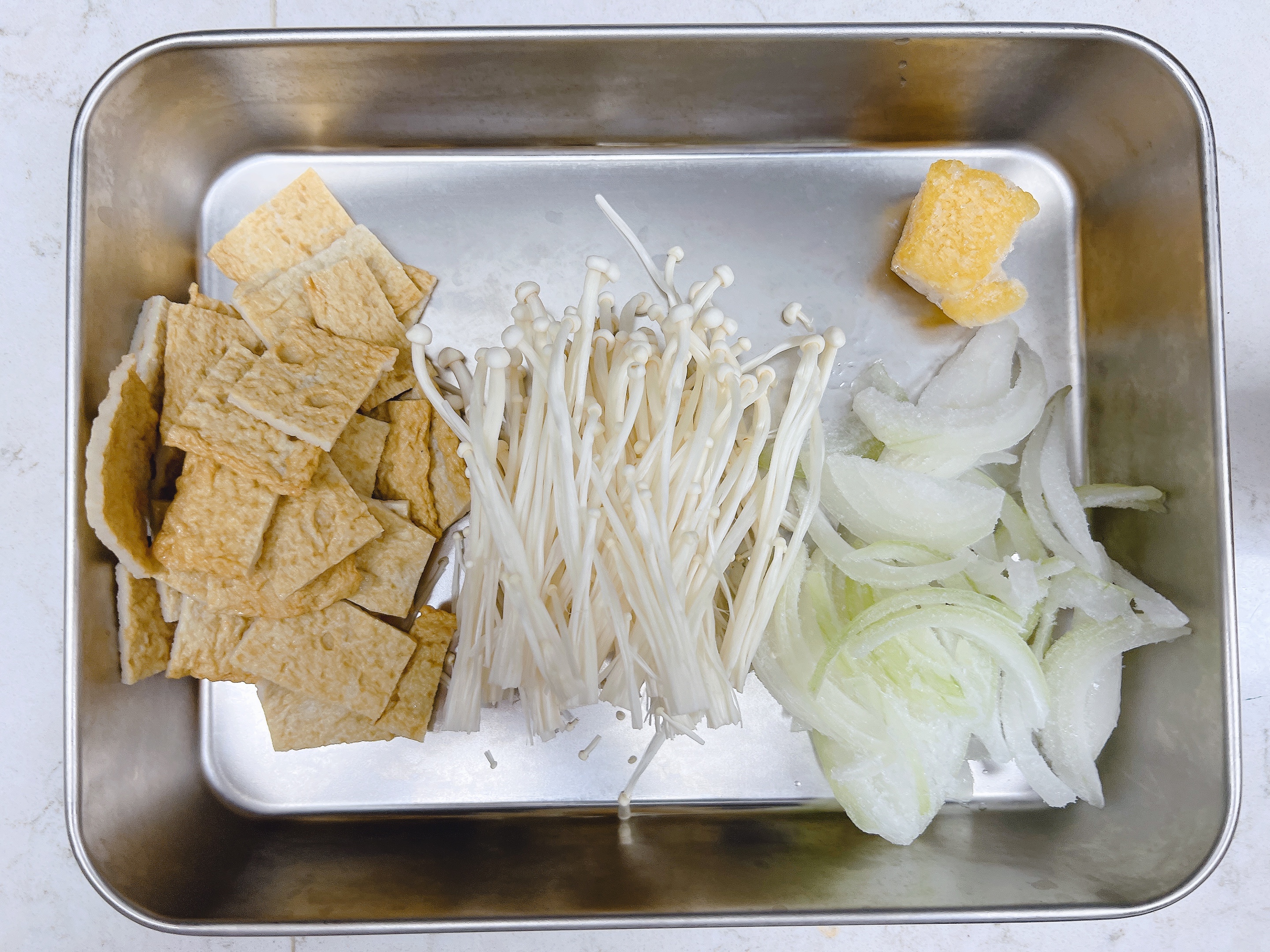 재료 : 어묵, 양파, 다진마늘, 팽이버섯, 굴소스, 참기름