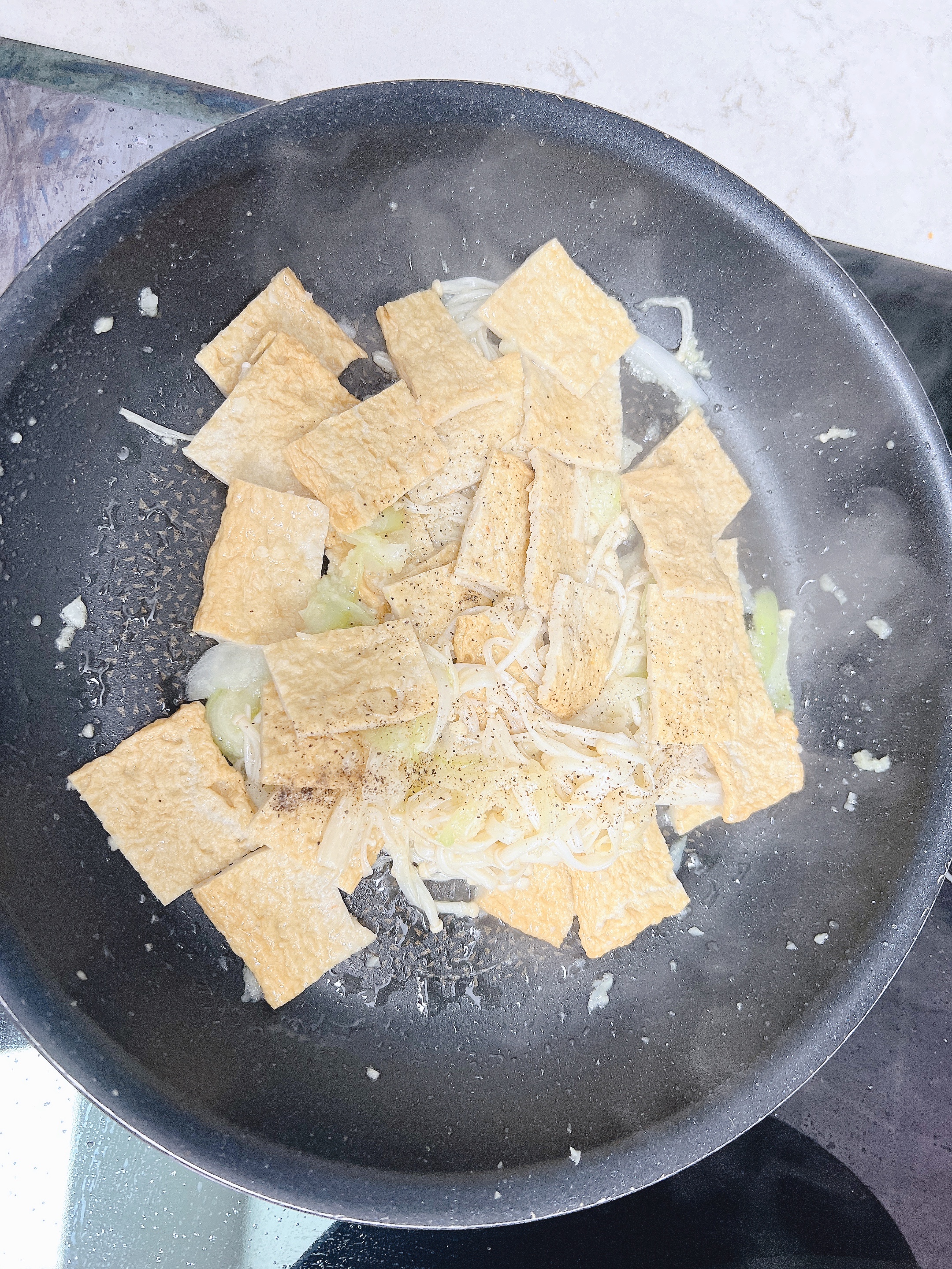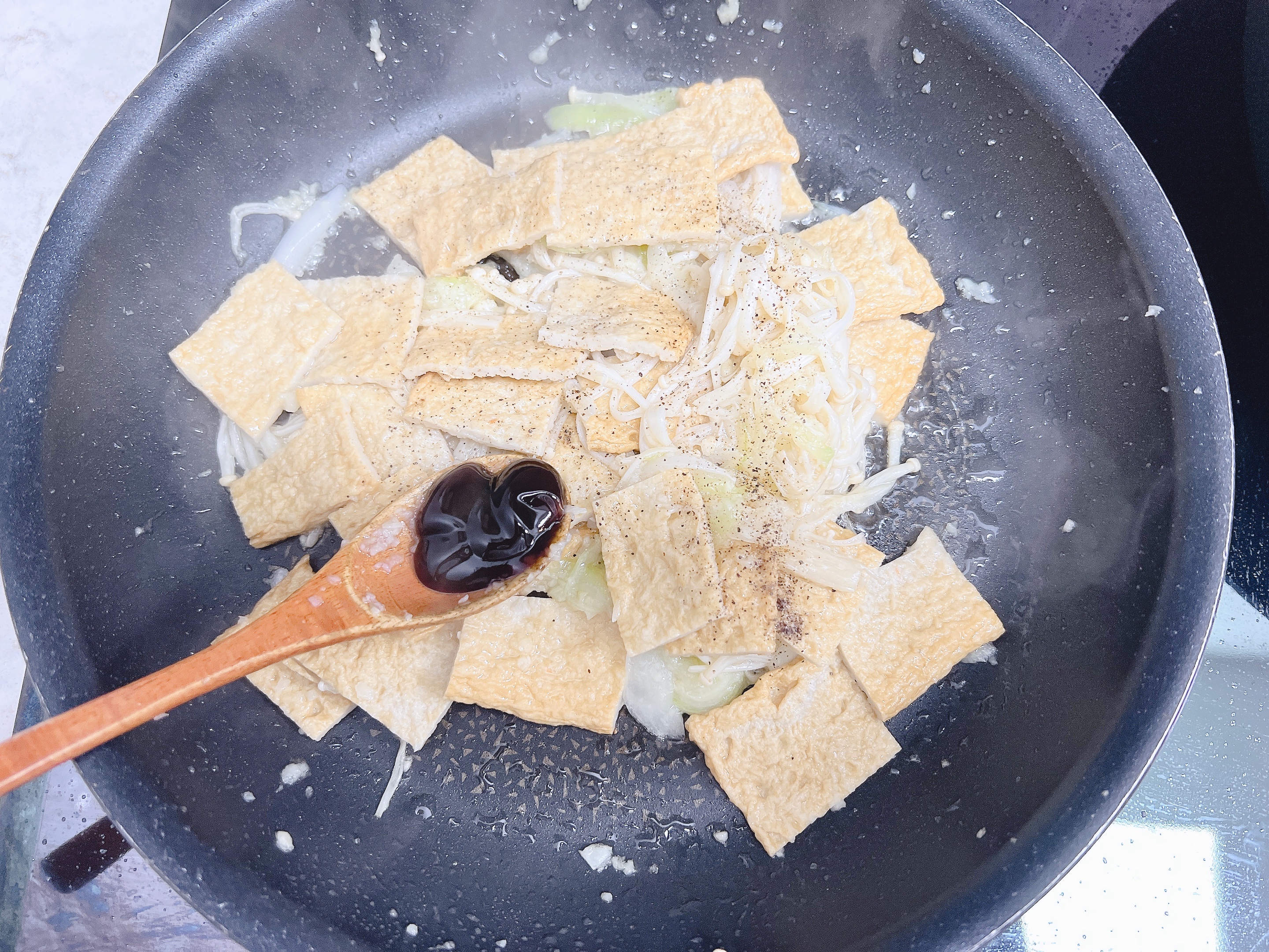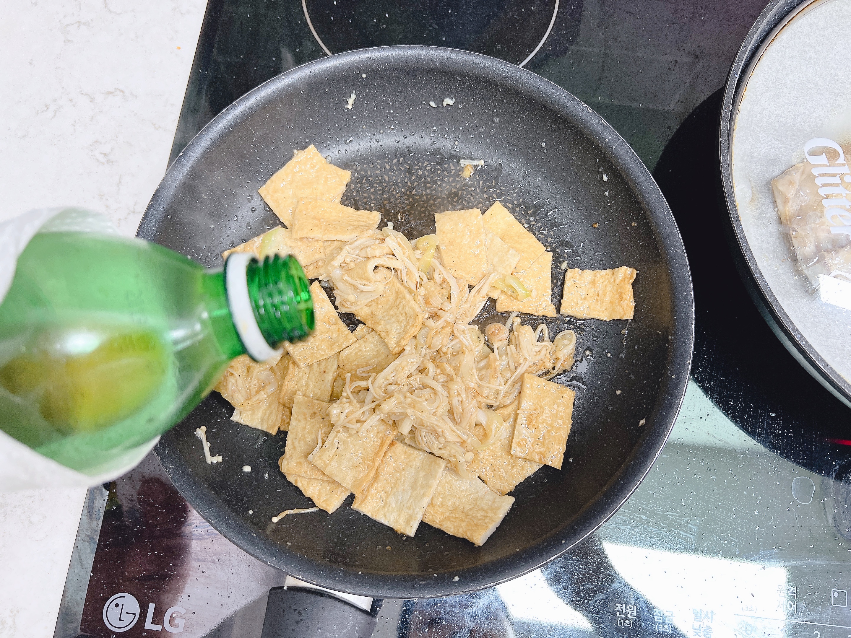 어묵과 팽이버섯을 넣고 함께 볶아줍니다. 후추도 톡톡 넣어주면 좋습니다.