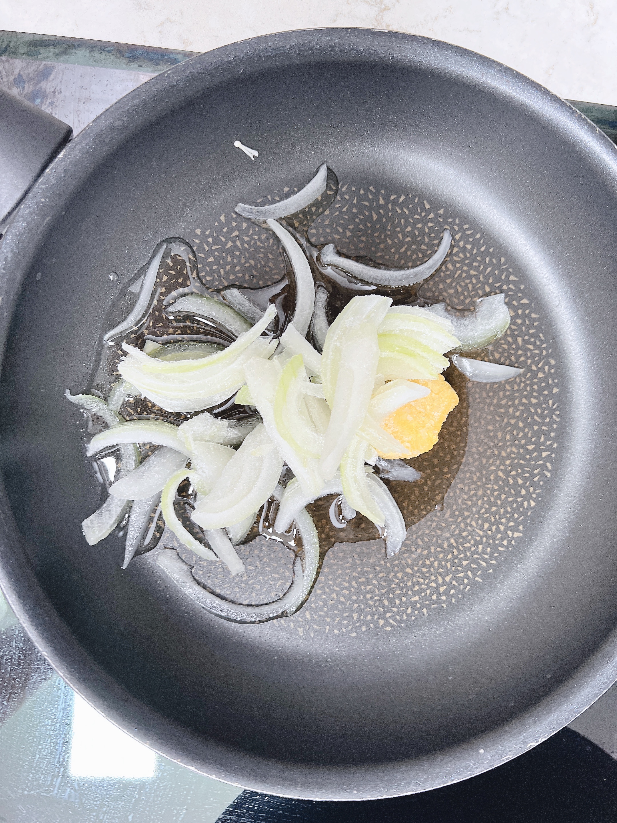 기름을 두르고, 다진마늘과 양파를 넣습니다. 중약불로 살살 볶으면서 좋은 향이 날 때까지 볶습니다.
