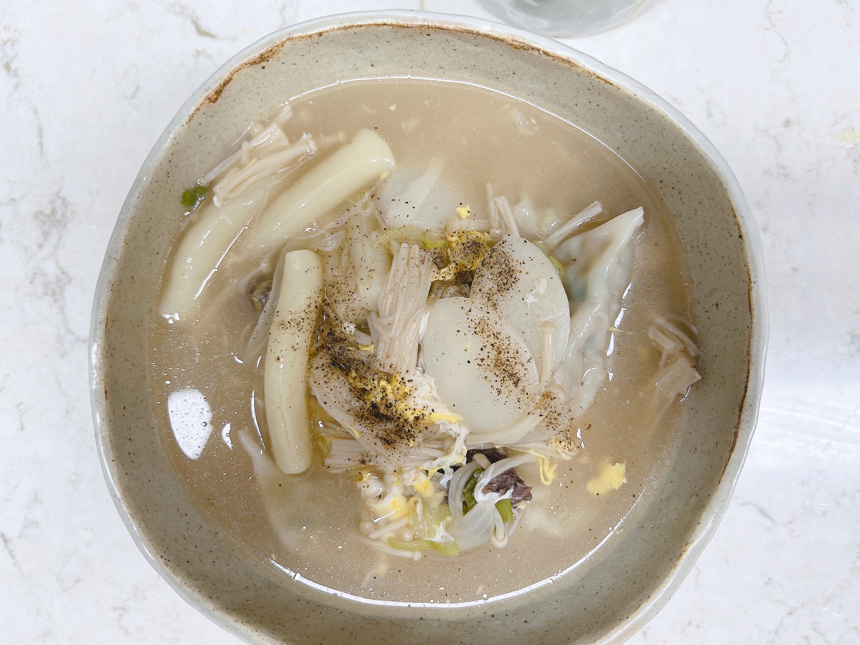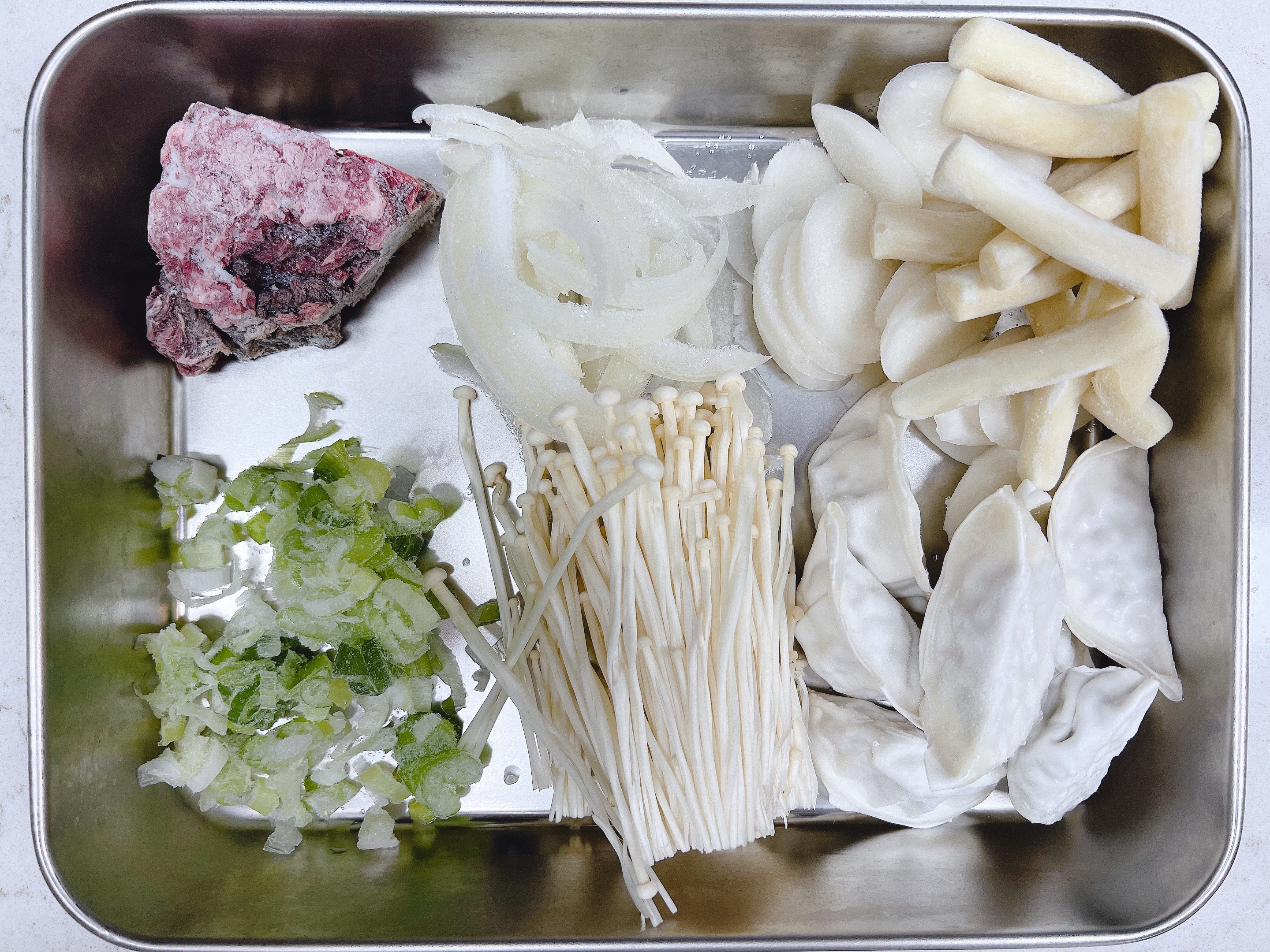 재료: 소고기 국거리(생략 가능), 파송송, 양파, 팽이버섯(있으면 넣으세요.), 떡국떡, 만두, 계란 1개, 소고기 다시다 1스틱(8g), 후추 톡톡, 소금간(필요시)