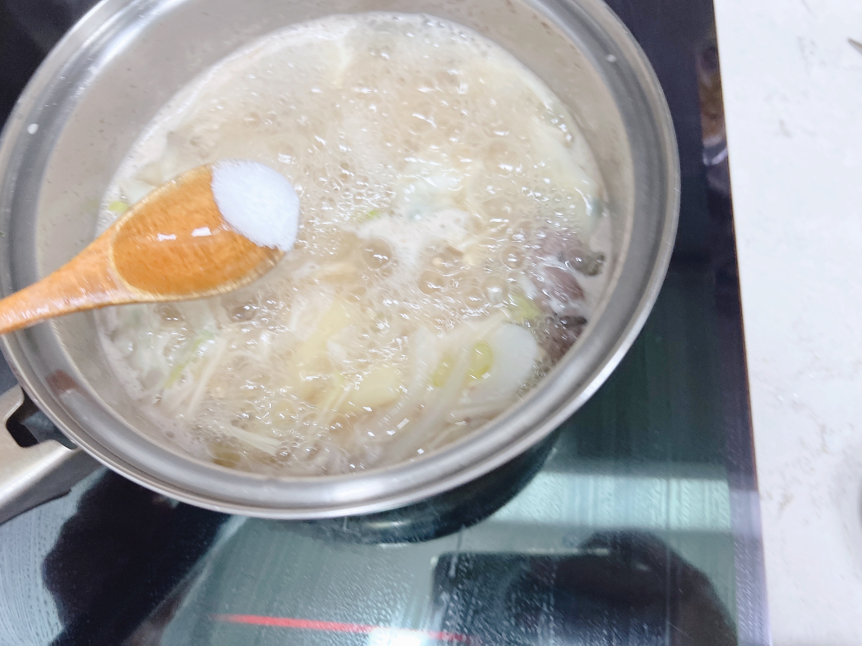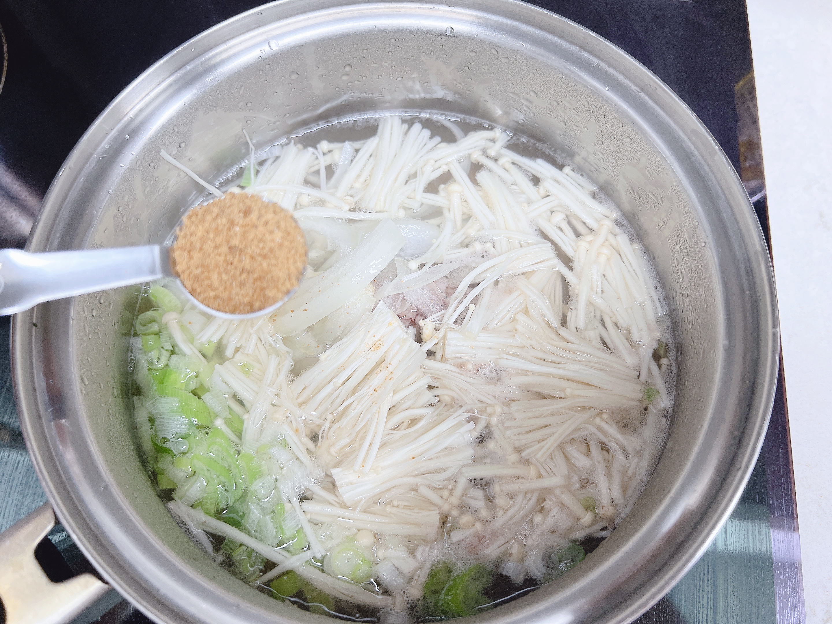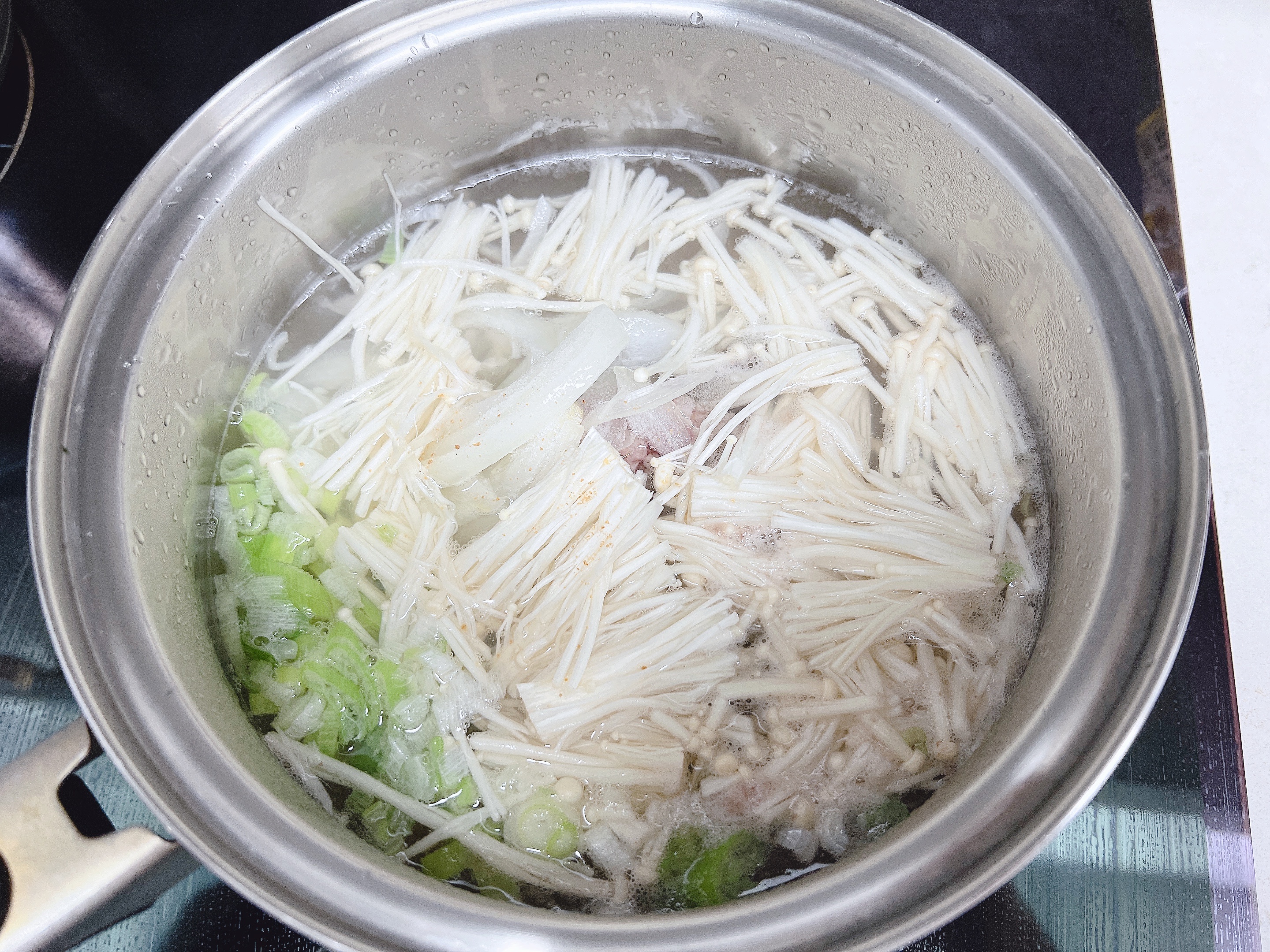 분량의 야채(파, 양파, 버섯)를 한번에 넣어 줍니다. 시간차를 두고 넣으면 맛의 차이가 날 지도 모르겠습니다. 하지만 저에게는 라면처럼 끓이기 편한 레시피가 필요했습니다. 매번 한번에 모두 넣고 라면 처럼 끓입니다.합니다.