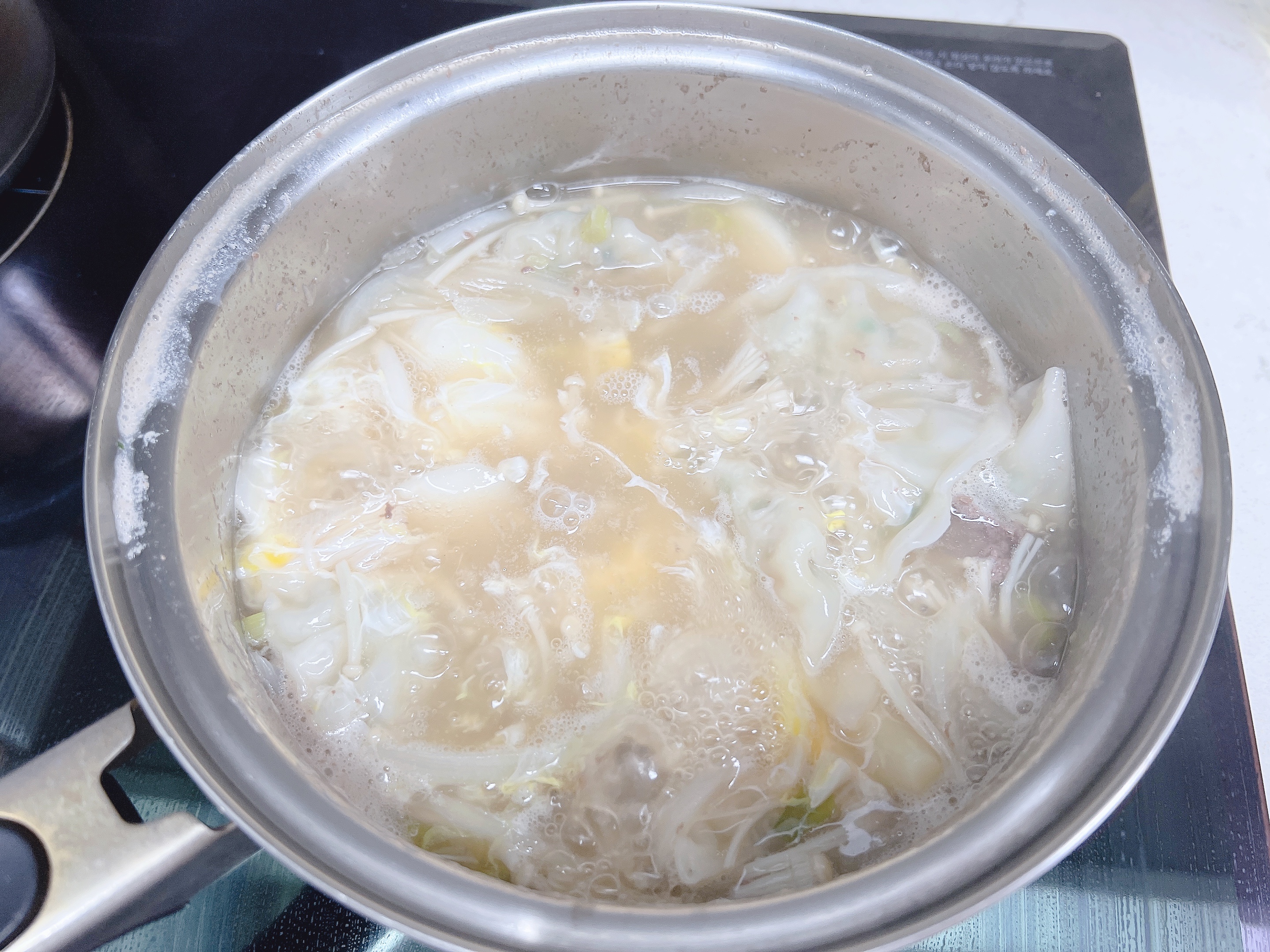 5. 보글보글 끓으면, 떡과 만두 넣기
