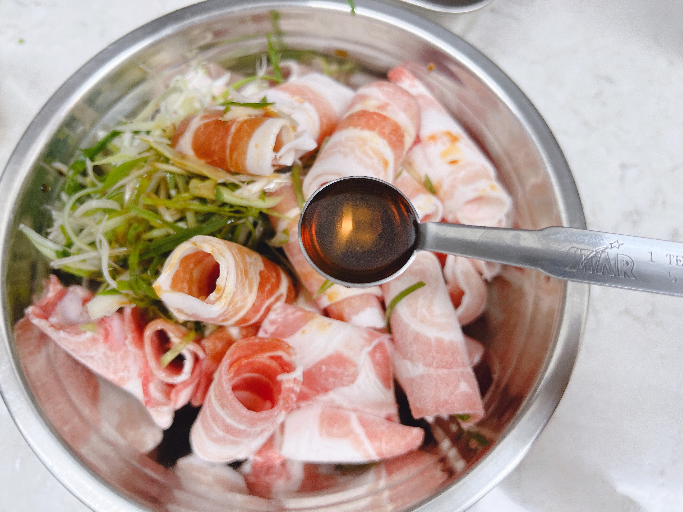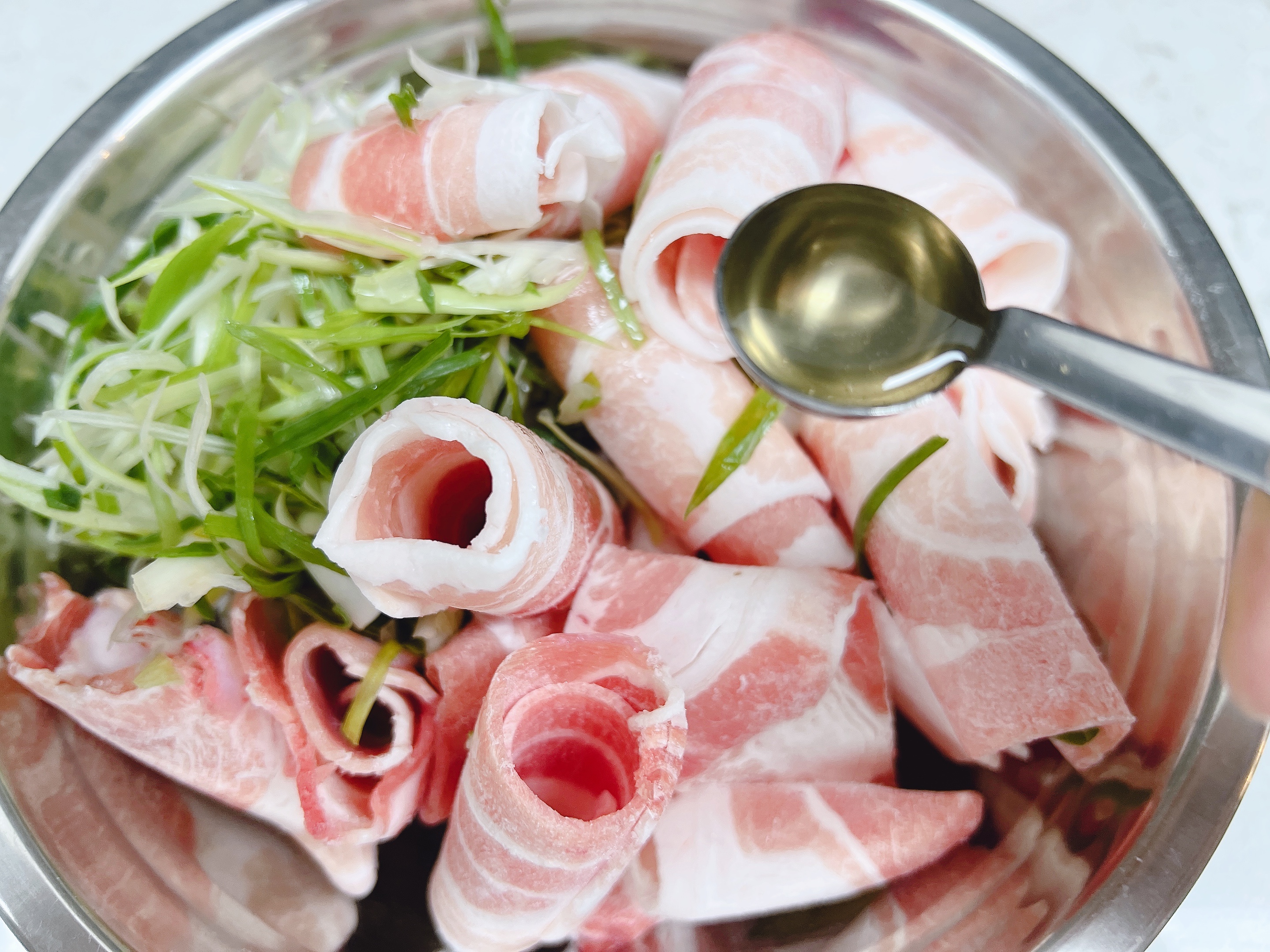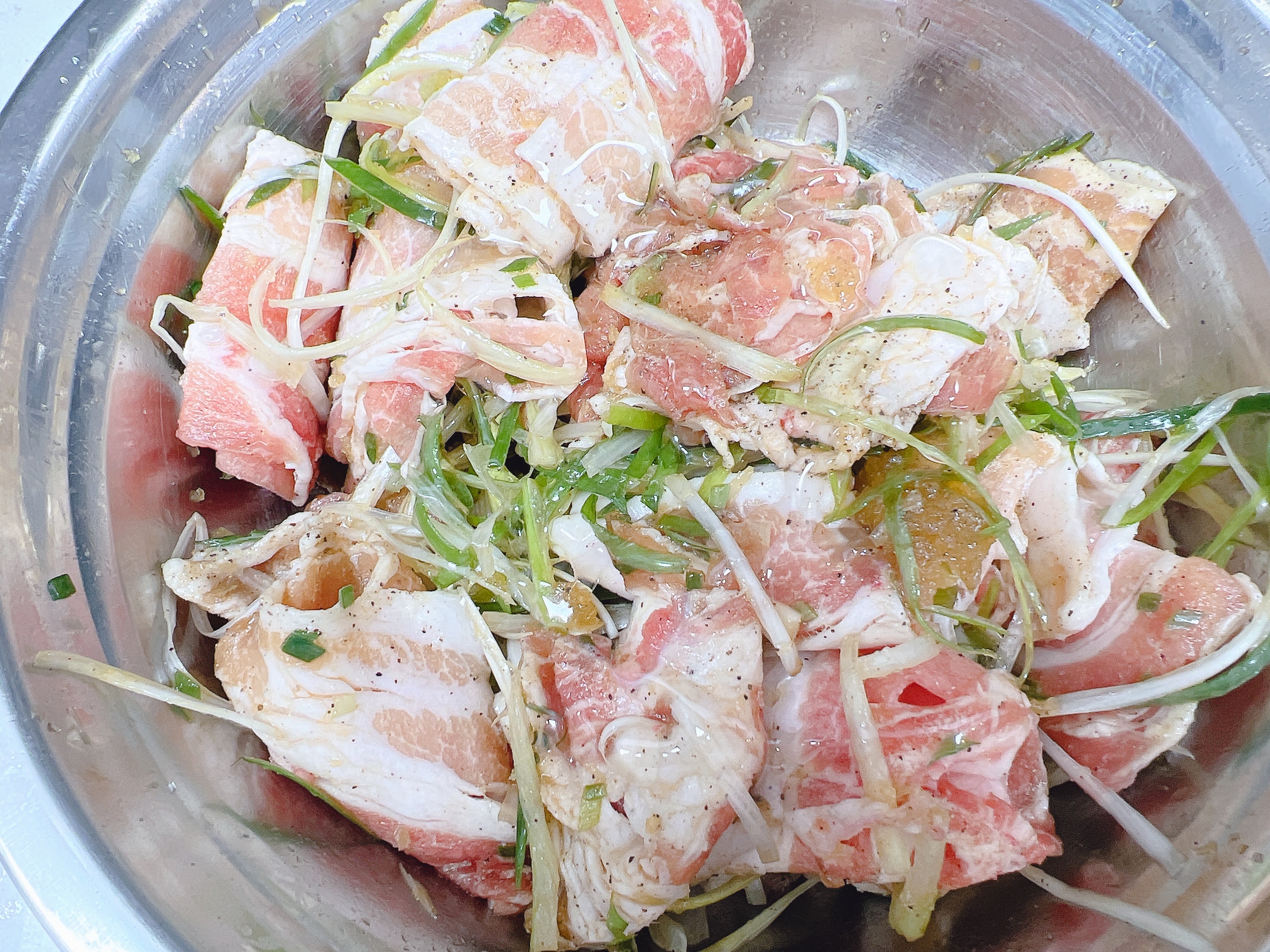 2. 채썬 파와 대패삼겹살을 가루양념애 넣어줍니다.