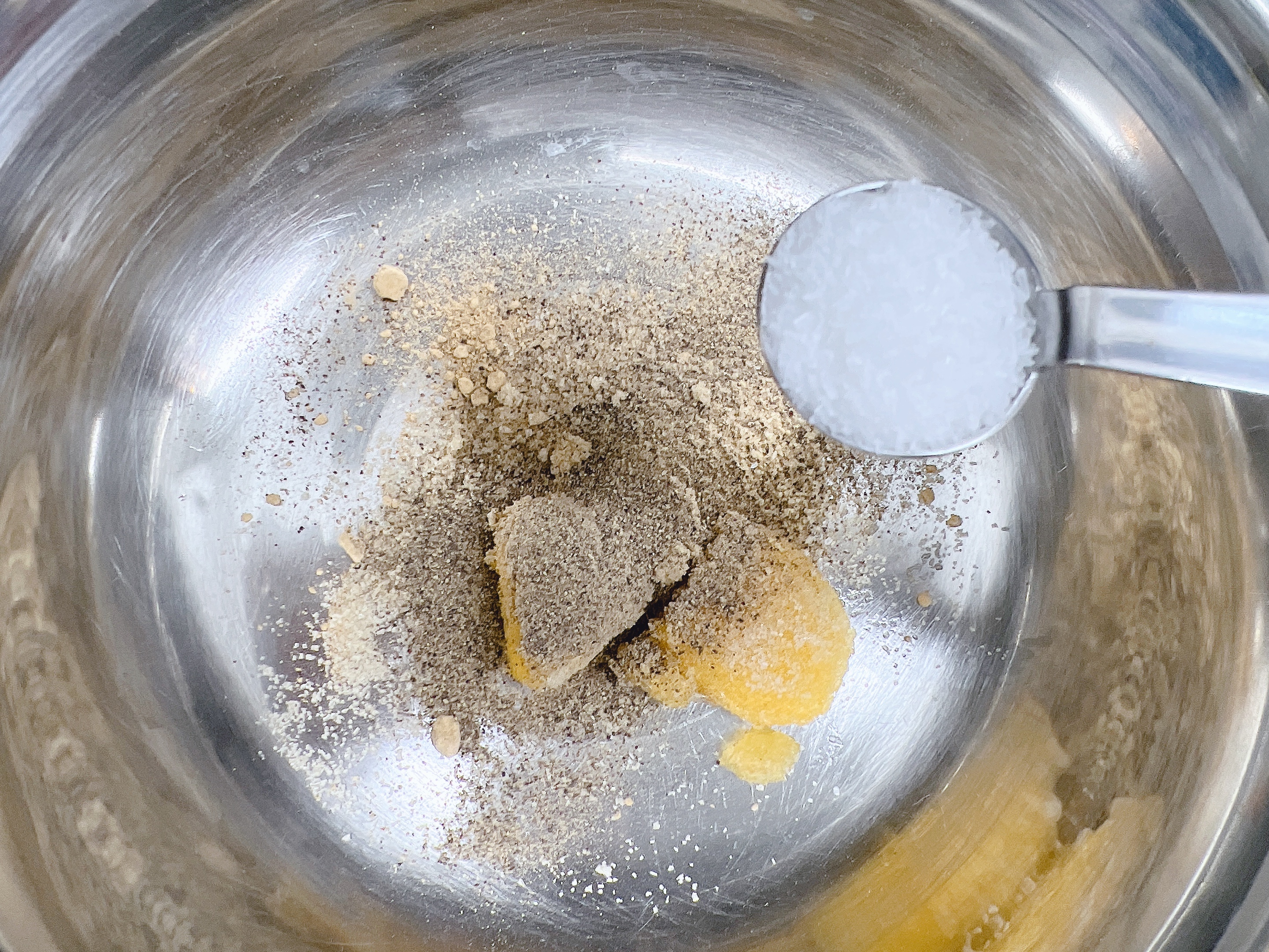 1. 다진마늘 2t에 가루양념(생강가루 1/2 t, 설탕 3t, 후추가루 듬뿍, 미운 1/2t)