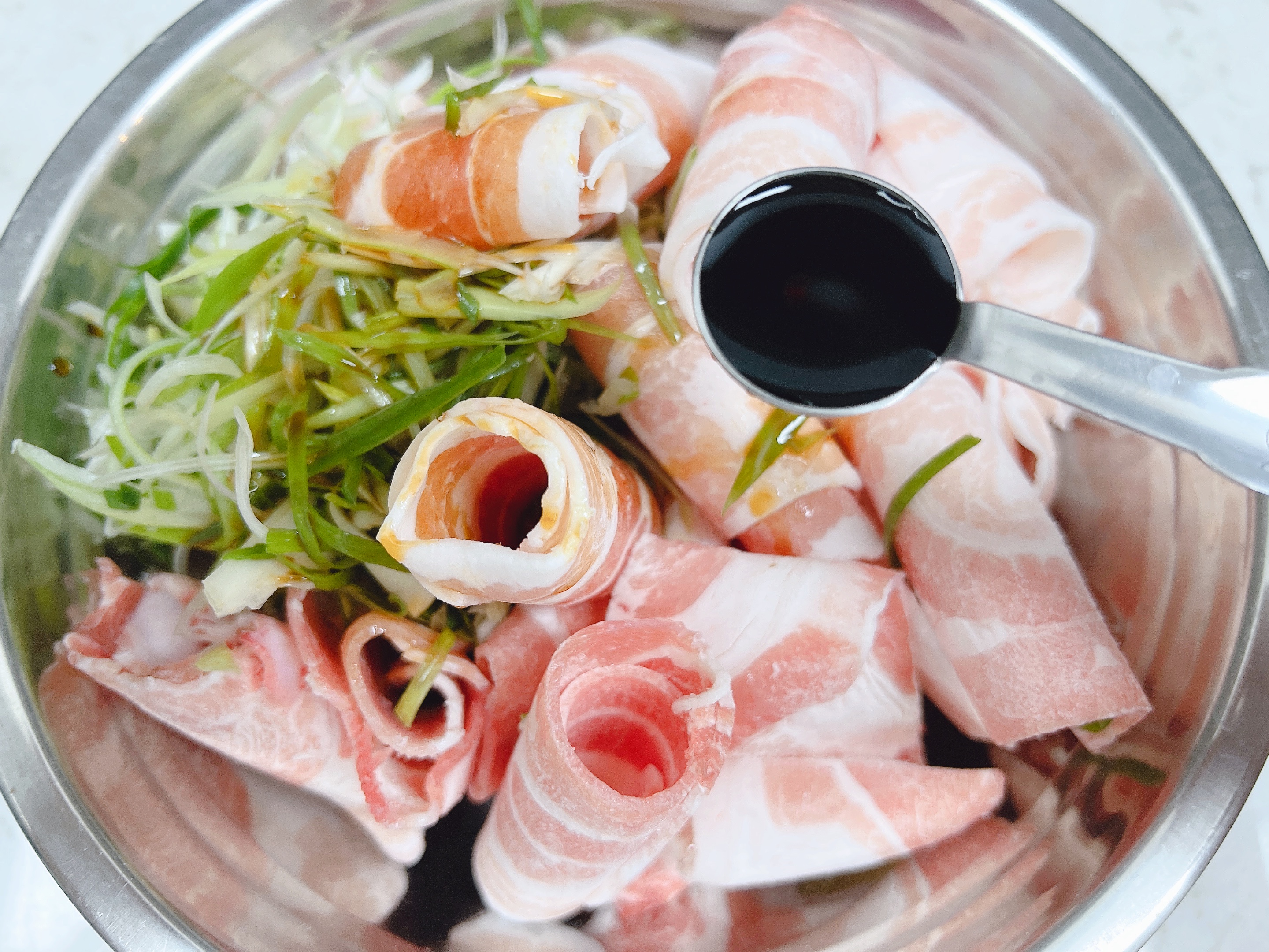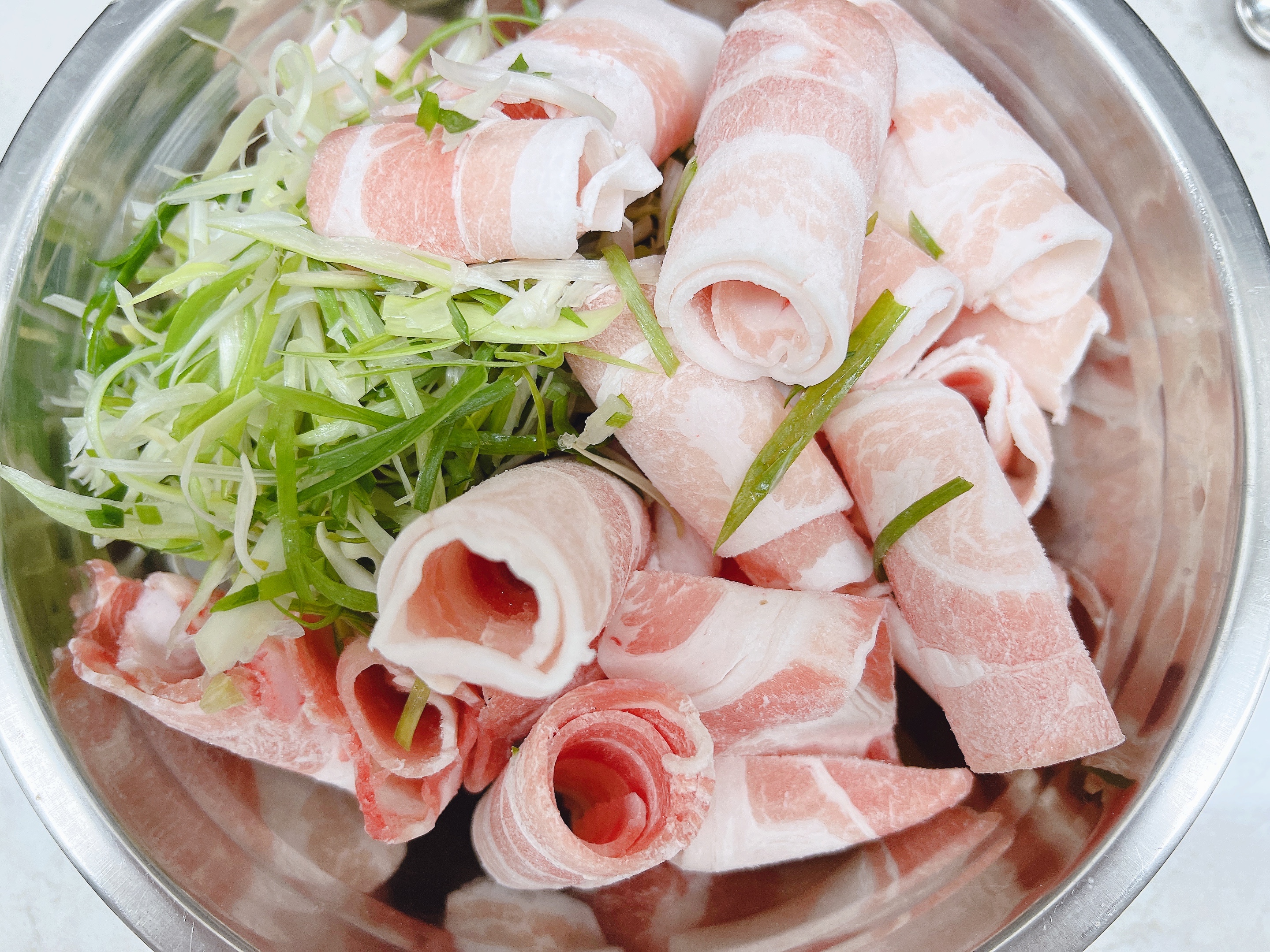 2. 채썬 파와 대패삼겹살을 가루양념애 넣어줍니다.