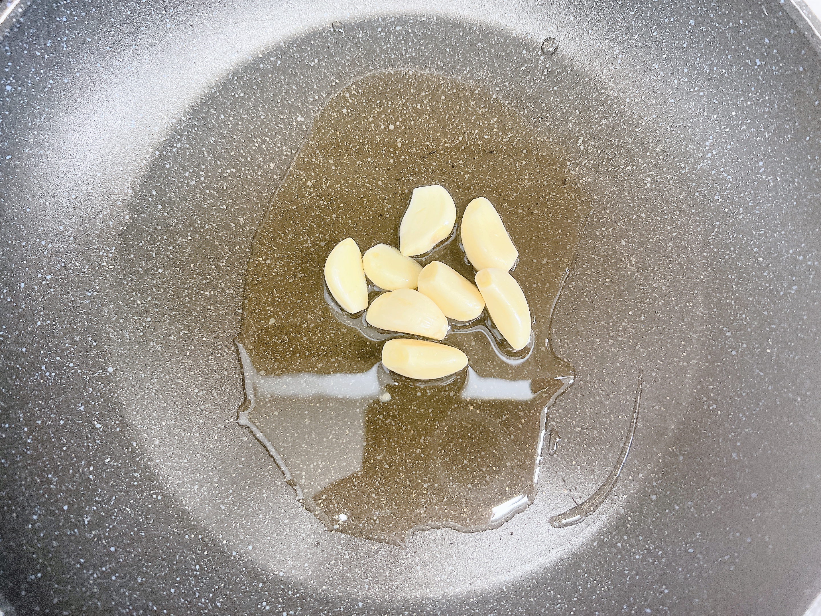 올리브유를 3바퀴 두르고 중불에 통마늘을 볶아줍니다. 마늘 익는 냄새가 솔솔 나면, 다음 단계로 넘어가면 됩니다.
