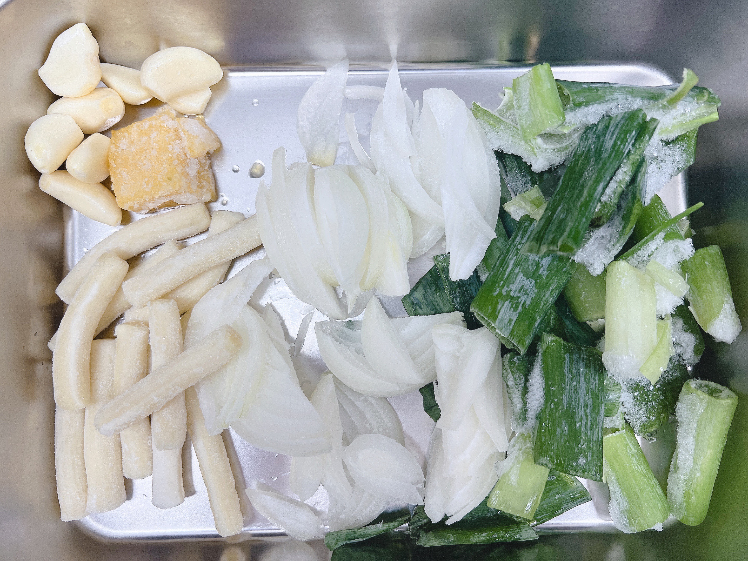 야채는 매번 필요할 때마다 준비하기에는 관리가 힘이 듭니다. 저희 집은 파, 양파, 다진마늘은 매번 재료를 사서 소분해서 냉동실에 넣어둡니다. 이렇데 하면 밑재료 준비에 시간을 단축할 수 있고, 야채가 냉장고에서 물러서 버리는 것을 방지할 수 있습니다.