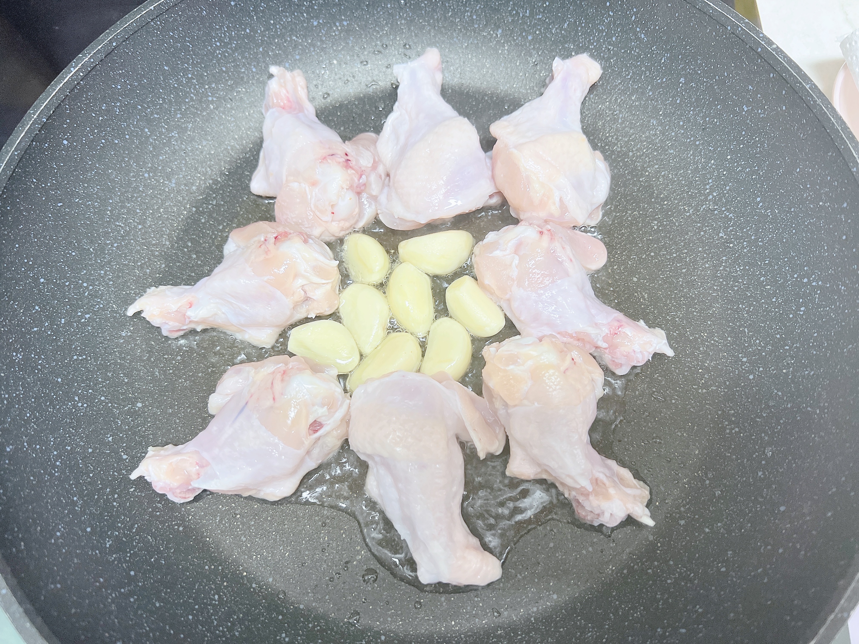 올리브유를 3바퀴 두르고 중불에 통마늘을 볶아줍니다. 마늘 익는 냄새가 솔솔 나면, 다음 단계로 넘어가면 됩니다.